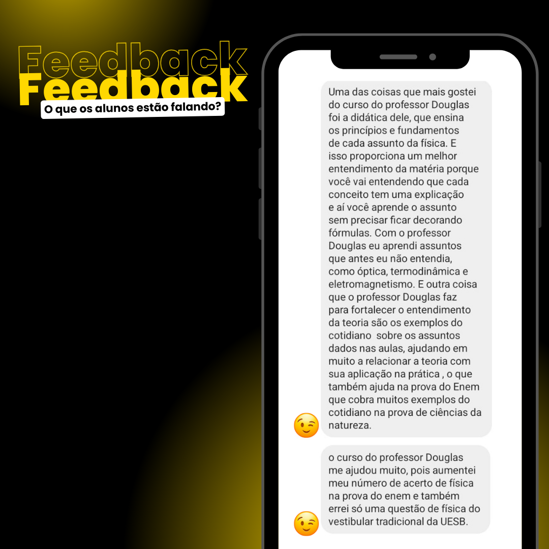 Em minha jornada já ajudei milhares de alunos, que passaram pelos meus cursos presenciais e online. O curso online Física com Douglas tem um objetivo muito importante: te ajudar a passar em Física no Enem ou nos vestibulares de Medicina de todo o país.