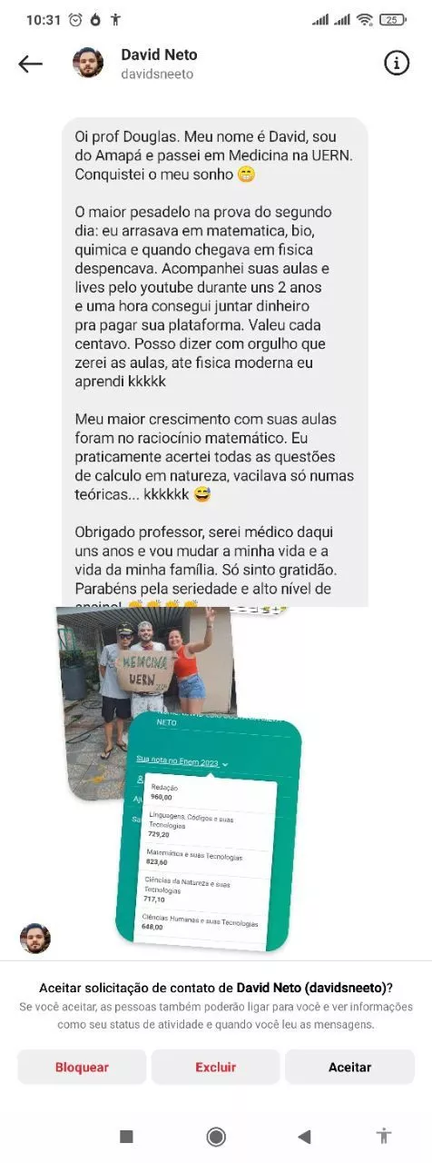 "E se eu te disser que o PROTOCOLO DCS já ajudou alunos como Amanda, que saiu de 667 pontos para 770 em Ciências da Natureza, ou Isabele, que conquistou uma vaga em Medicina na UFPB? Eles não são diferentes de você – apenas usaram o caminho certo para estudar física."